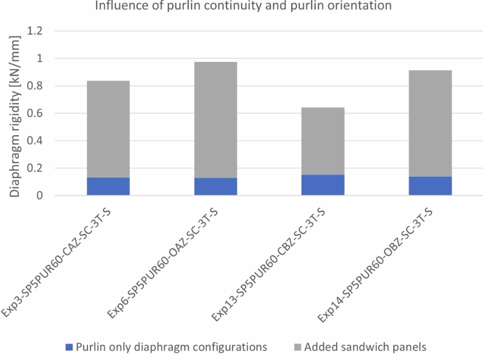 In another research, diaphragm rigidity of purlin only diaphragm configurations and the supplemental diaphragm rigidity due to the inclusion of the cladding is investigated.