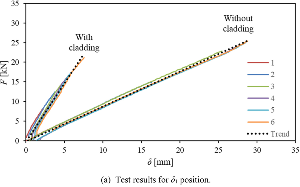 In research by Židlický et al. in 2024, an experimental study about the influence of sandwich panel cladding on horizontal stiffness of a steel monopitch portal frame structure made in two stages – without and with roof sandwich panel cladding. The results from the reference, are presented in figure below.