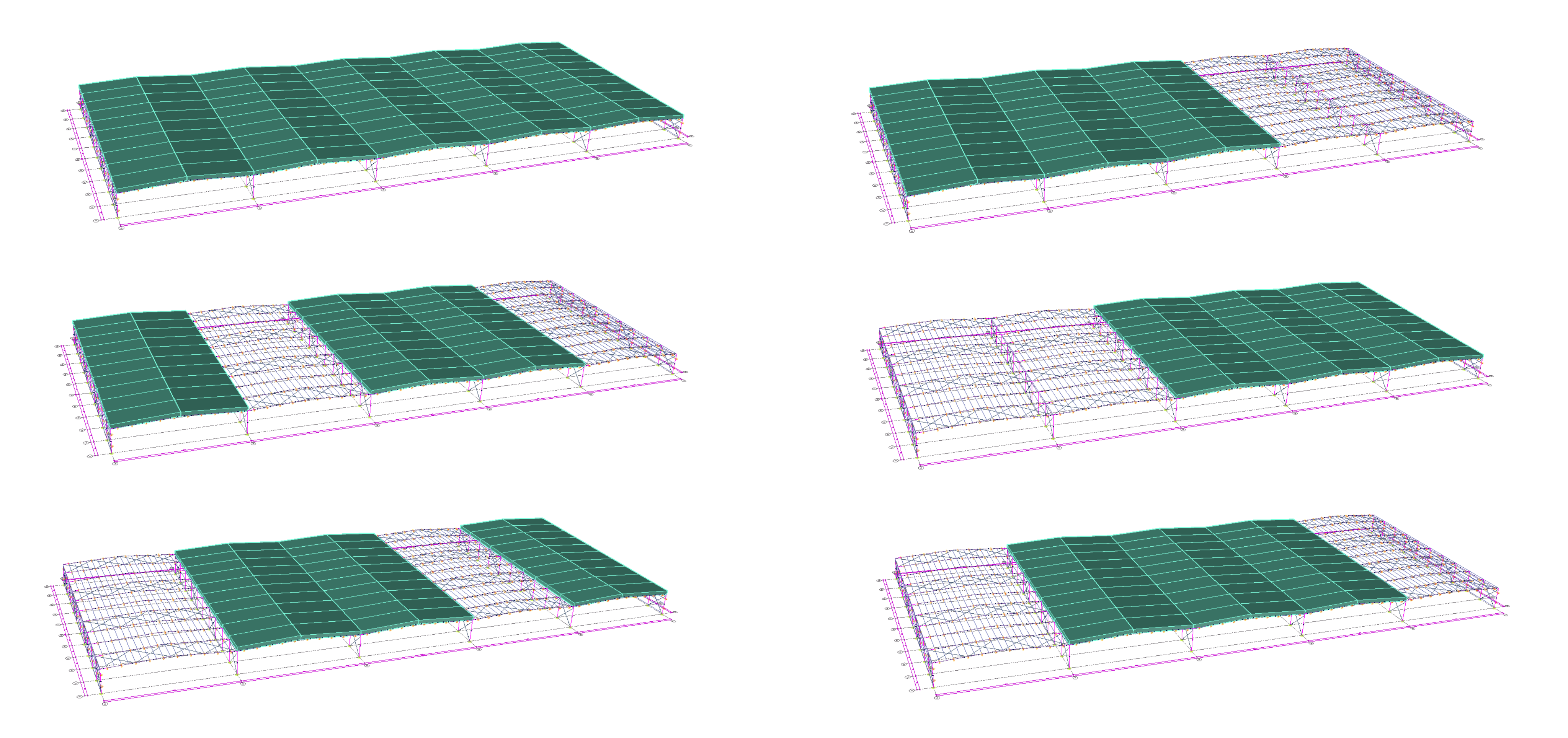 MkaPEB accounts for the above requirements when applying roof live loads for the design of both primary frame members and secondary members (Purlins). However, because the tributary (loaded) area of a purlin is typically less than 200 ft², the roof live load is applied without reduction. For the primary frames, the tributary area is typically greater than 200 ft²; therefore, the roof live load is reduced in accordance with the table shown above from [1], and is applied using the load patterns presented below, consistent with the MBMA manual [2].
